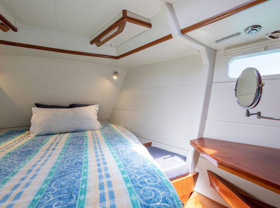 • Cabins: 3 (Master cabin with en-suite, guest double, and crew cabin with two singles)